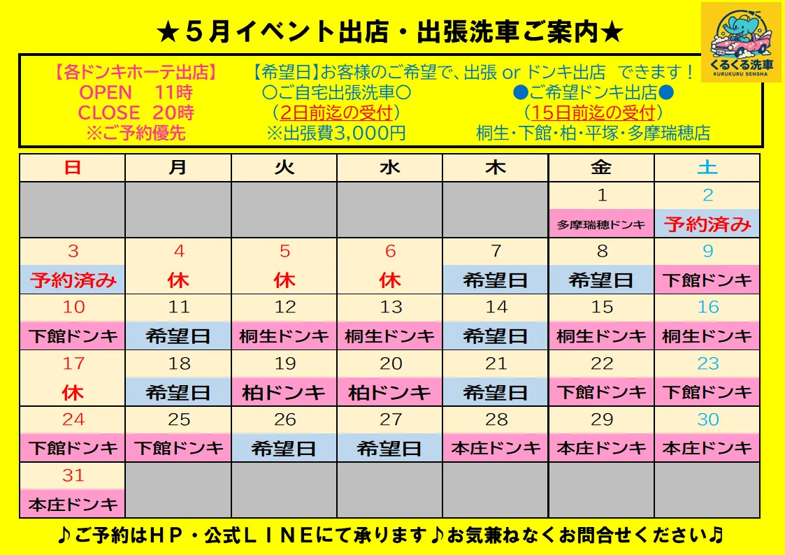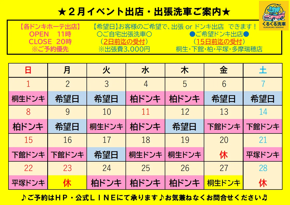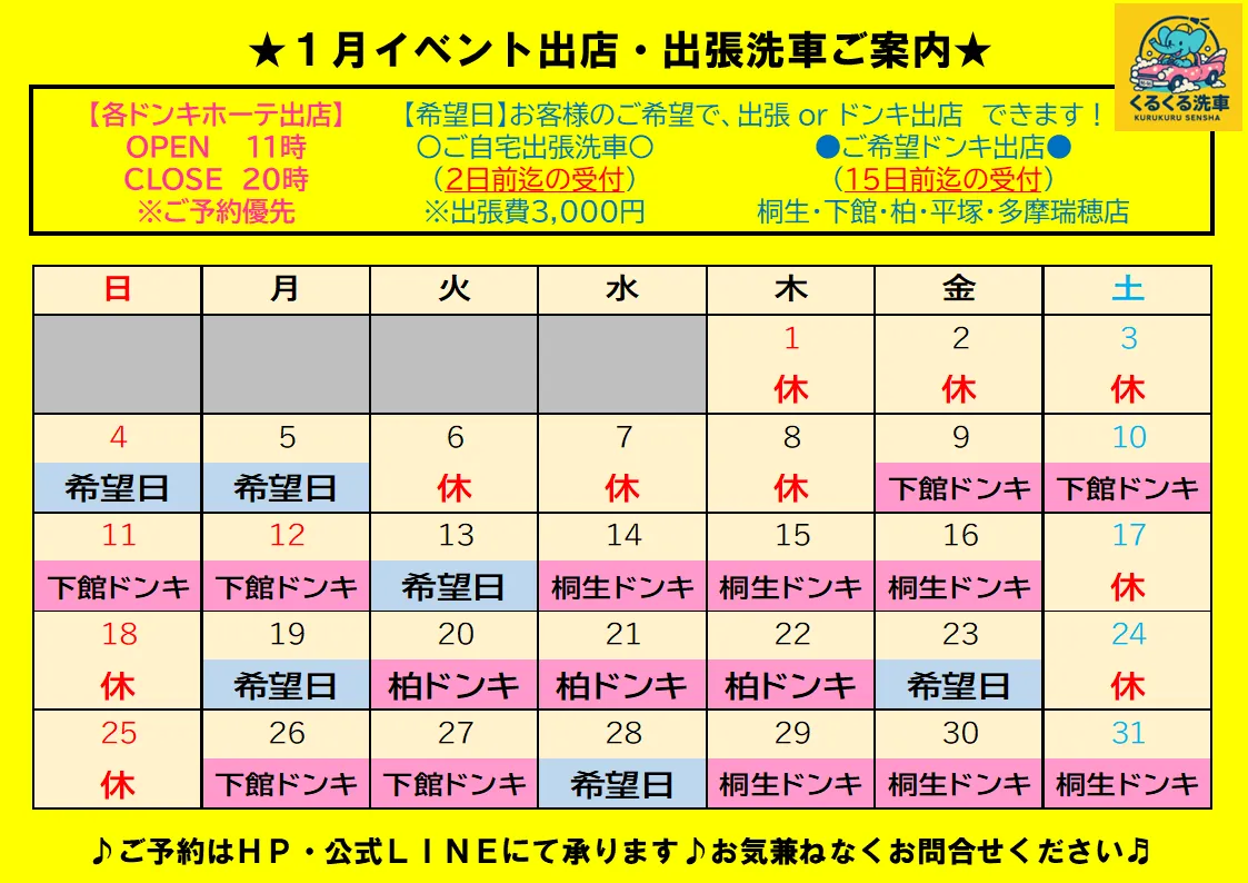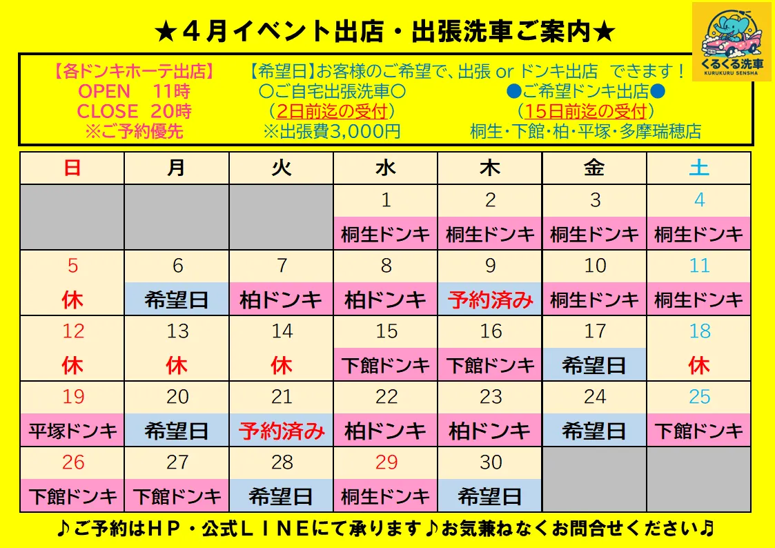 洗車・コーティング専門店というと、初めての方は少し頼みずらい行きずらい、、、というイメージもあるかもしれませんが、くるくる洗車はドン・キホーテ様や住宅展示場(積水ハウス様)などの駐車場でイベント出店しておりますので、お買物ついでに気軽にご利用いただけます♪